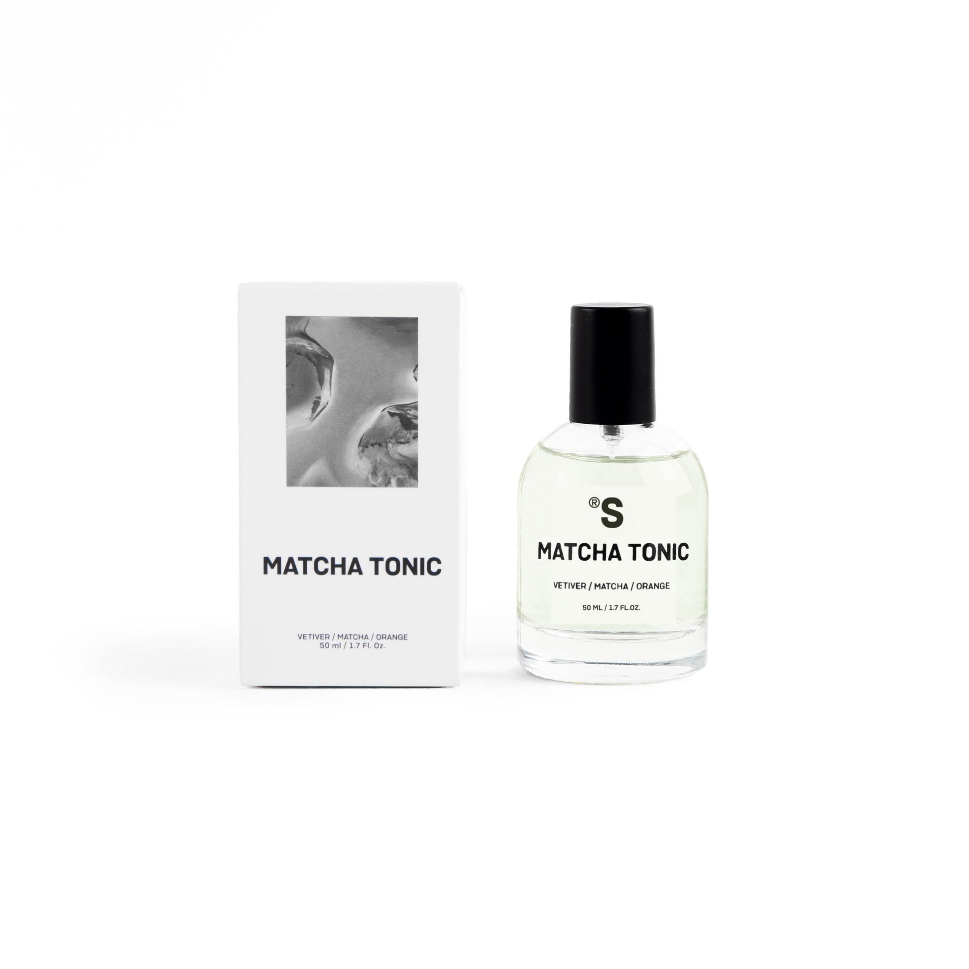 The composition features citrus notes of orange and fresh notes of vetiver and matcha.